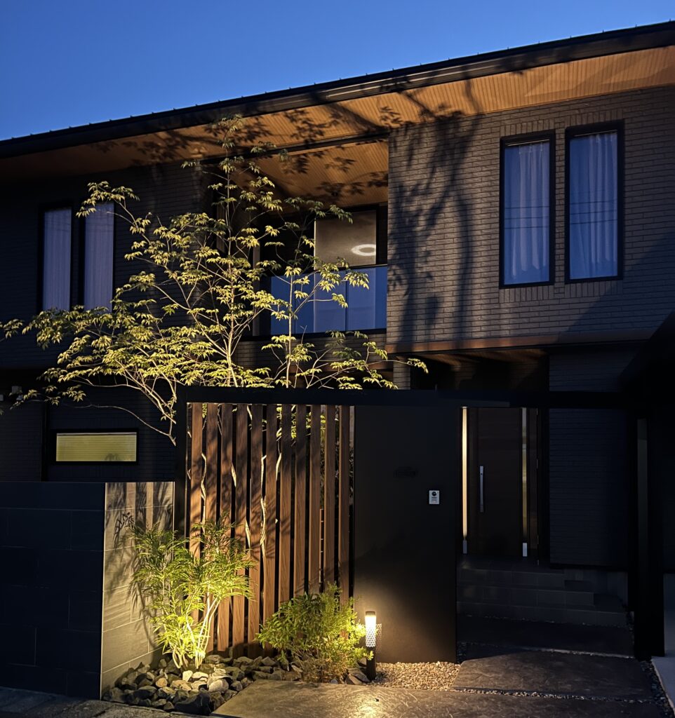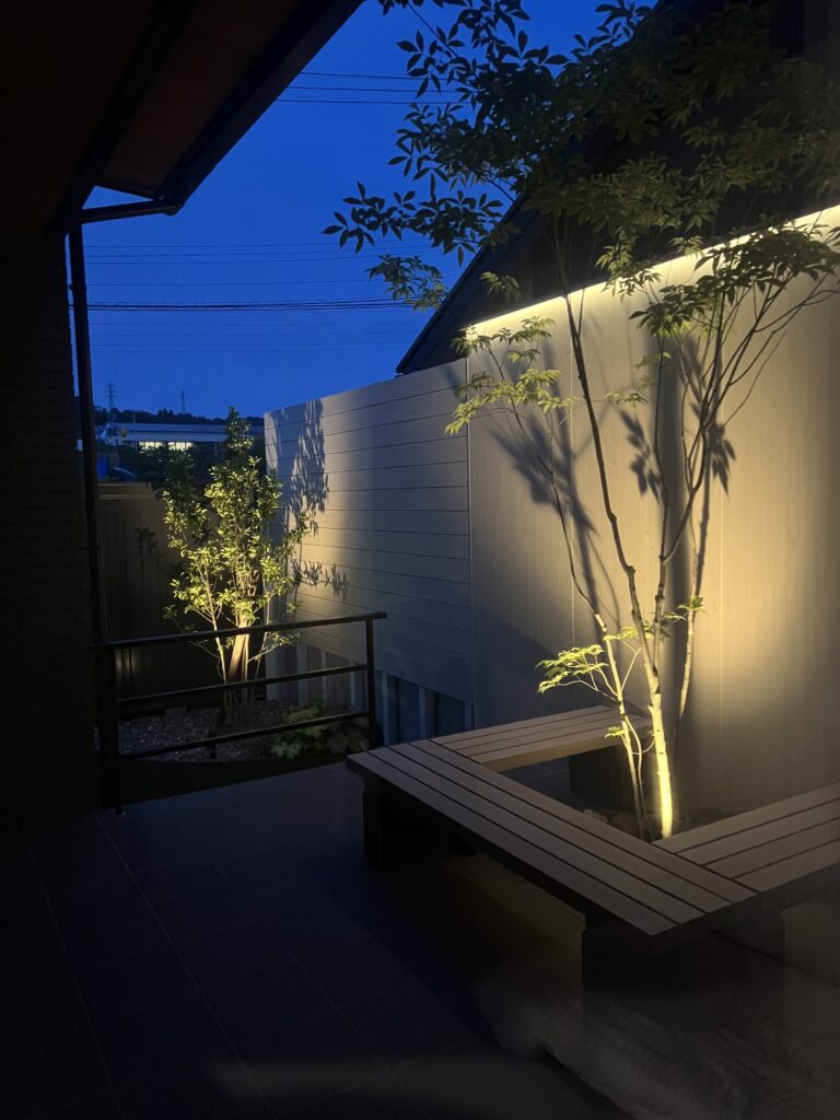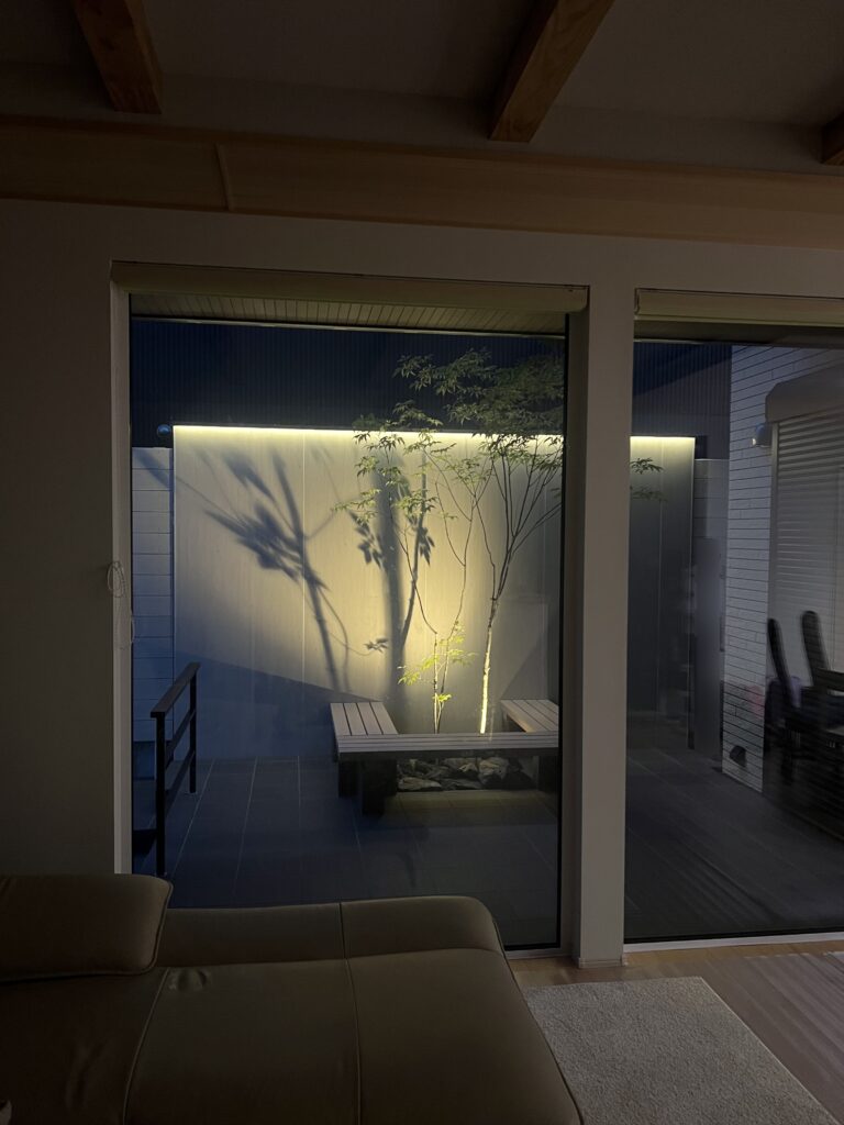 ライトアップされたアオダモが軒下まで美しく葉陰を映し、2階の部屋からも楽しむことが出来ます。